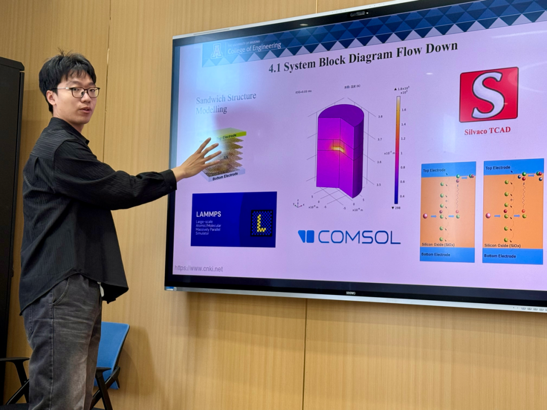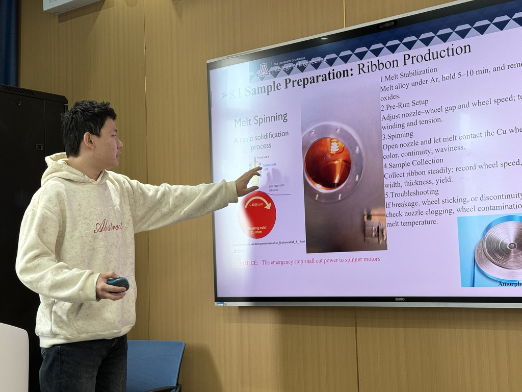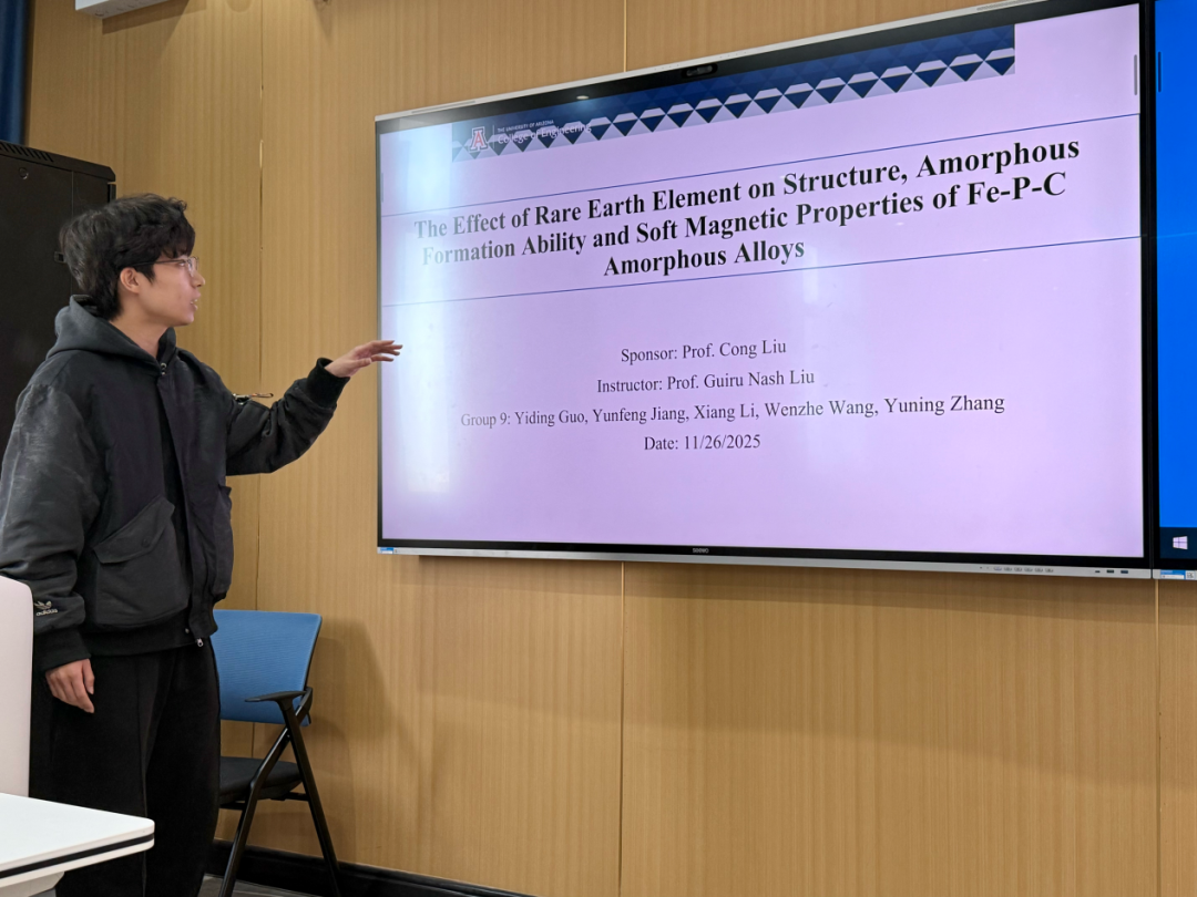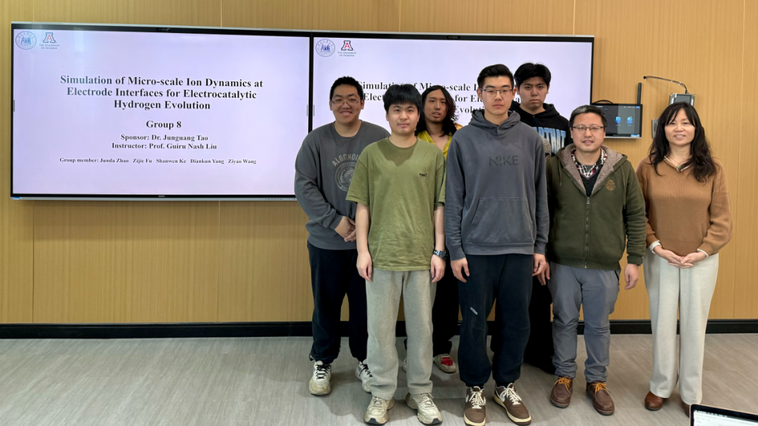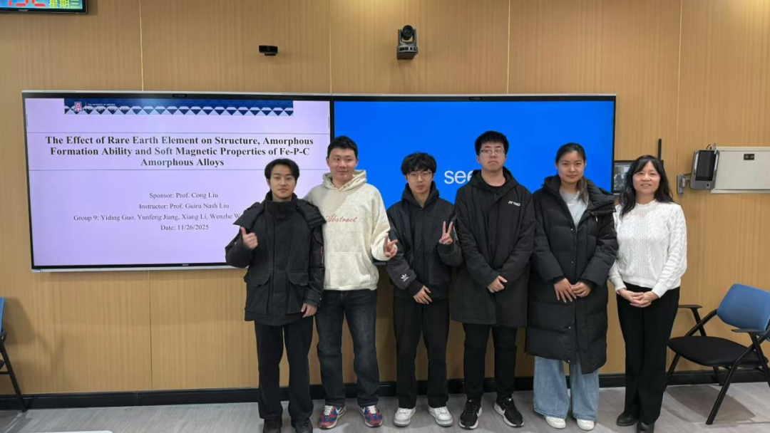 在材料物理专业本次跨学科设计A毕业设计实践中,熟女 Guiru Nash Liu教授、Philip Nash教授与罗鸿志、陶俊光、阎文博、李薇薇、刘方舟、刘丛这些校内导师组成国际化-交叉化联合指导矩阵。值得一提的是,10组课题中有9组由导师结合各自学术难题定向抛出,第6组“基于位错密度的忆阻器可靠性预测软件”则由学生自主阅读数篇文献后独立命题——该器件被视为模拟大脑突触的核心元件。其余课题同样锋芒毕露:第2组“镍锰基赫斯勒合金空调制冷/制热系统”成功构建固态制冷原型,正准备申请国家发明专利;第8组“电极界面处电化学析氢的微尺度离子动力学模拟”构建低能耗光电催化体系实现高效水分解制氢,为下一代清洁能源提供新路线;第1组“发展高强度与优异软磁性能Fe-P-C非晶线材大规模连续化生产的工艺”与第9组“研究稀土元素对Fe-P-C非晶合金的结构、非晶形成能力和软磁性能产生的影响”形成非晶合金“工艺—性能”闭环;第3组“钠离子电池中煤基硬碳阳极的研究”为低成本储能提供碳素解决方案;第4组“单光子探测系统”突破极限弱光探测瓶颈;第5组“提高钙钛矿太阳能电池效率的研究”瞄准新一代光伏技术;第7组“探究FEP薄膜表面电位的时空演变规律”揭示介电薄膜电荷演化机制;第10组“基于光伏电荷打印的水性微流体机器人”将光伏电荷打印与微流体操控融合,形成“材料—能量—信息—生命”全链条交叉格局。